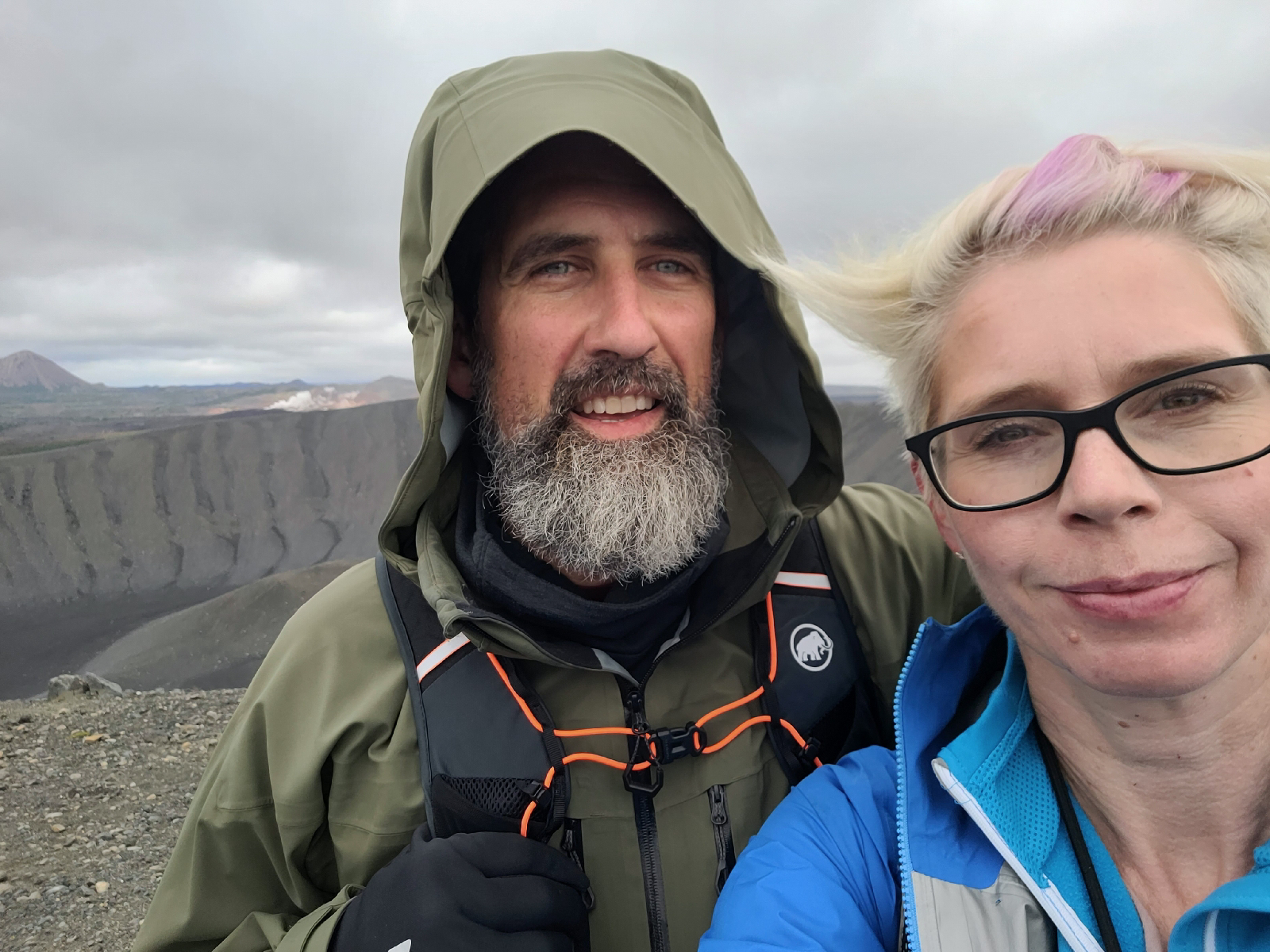 Aber: wir sehen hinter dem Lavafeld schon unseren nächsten Stop: den Hverfjall-Krater, auf den uns ein 30minütiger Spaziergang angekündigt war. Der Plan im Lavafeld sagt: der Weg dorthin wäre nur 1.6km (nicht klar, ob einfach oder incl Rückweg, aber das ist ja egal), famit kämen wir den Leuten aus und müssten nicht nochmal auf einen Parkplatz juckeln. Also: Rucksack mit Brotzeit und Mütze/Handschuhen und aus Versehen doppelt eingepackten Fleece gepackt und los geht's.